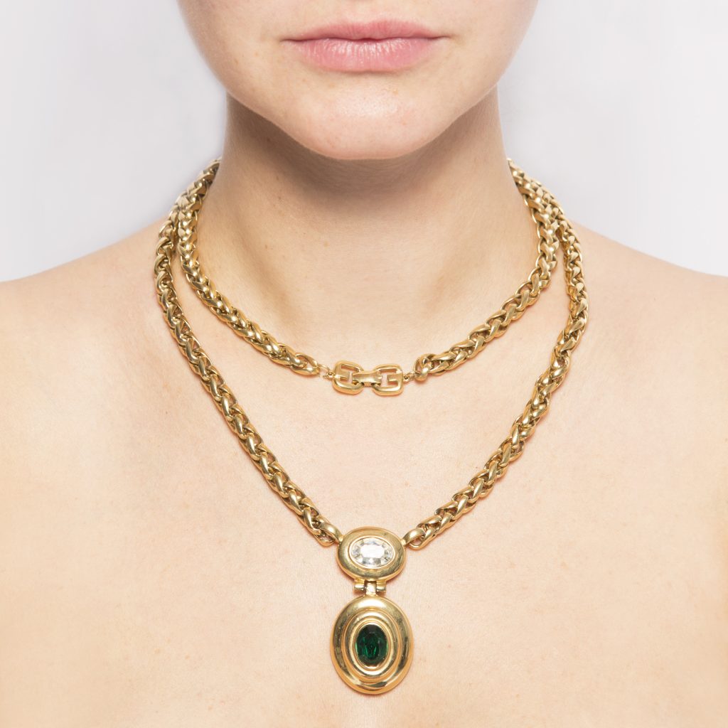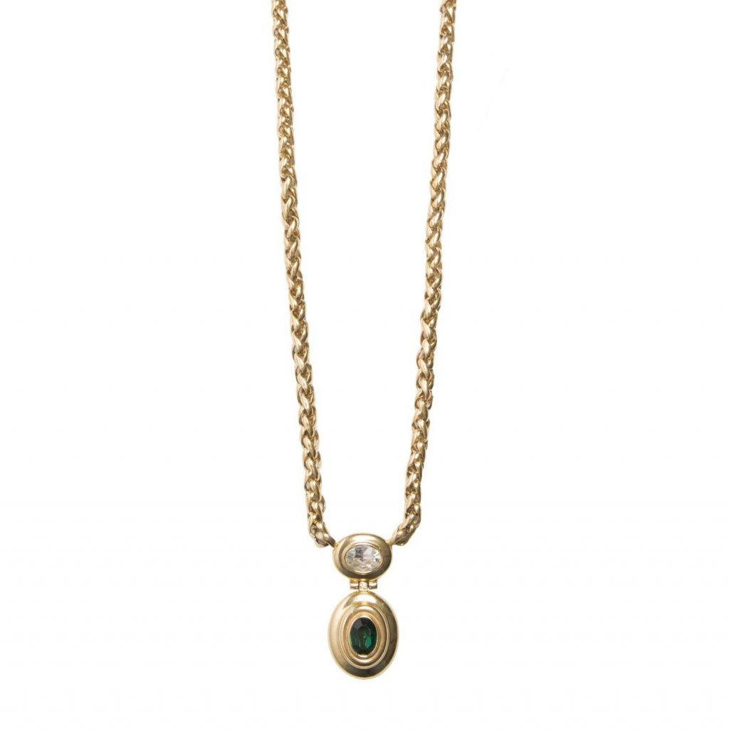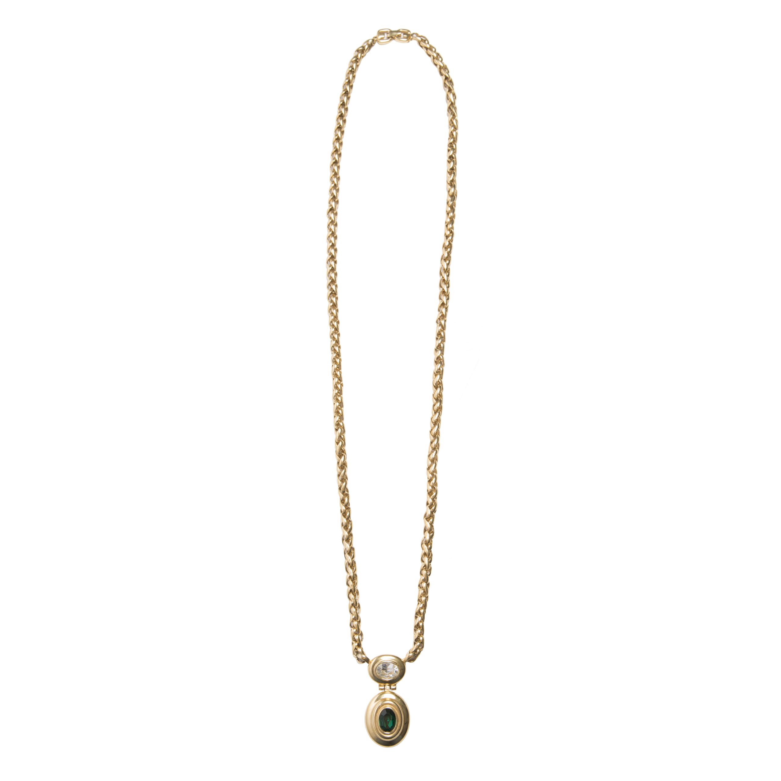Vintage green stone long gold necklace